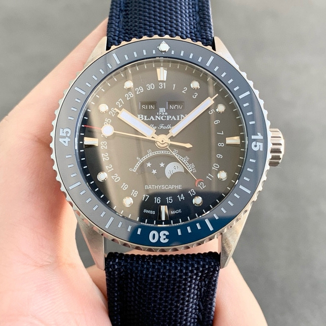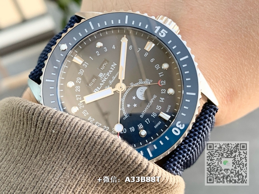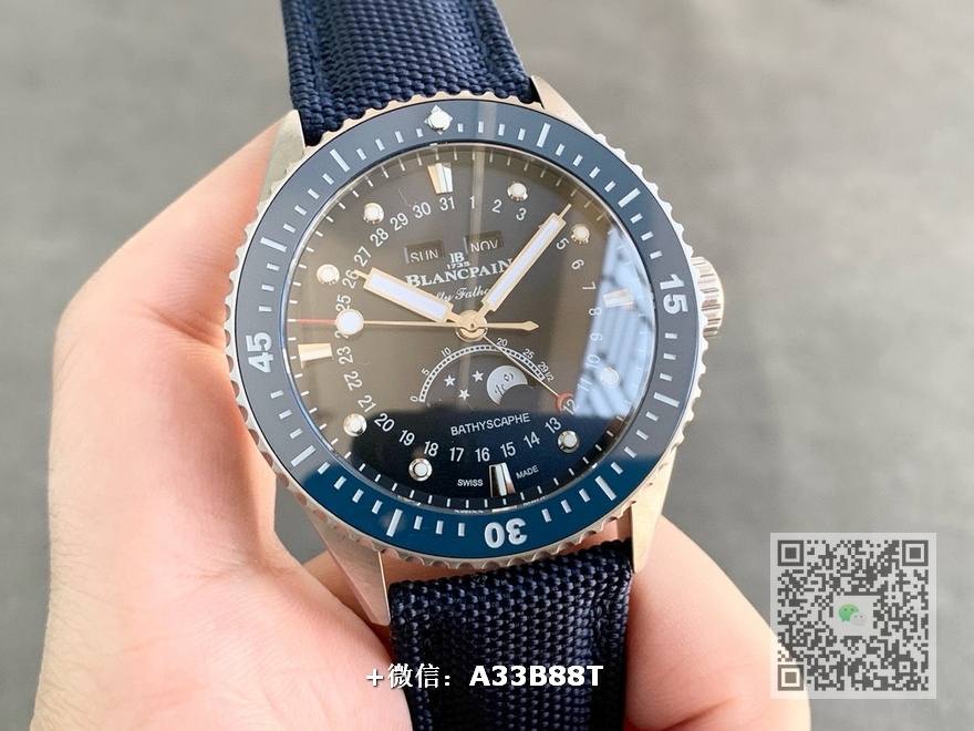 【品牌】宝珀【产品介绍】TW厂手表力作宝铂五十寻系列,5054-1110-B52A。压轴巨献,大三针夜光设计,直径43毫米,厚度13.3毫米!搭载6654.P自动机械机芯,具备星期显示,日期显示。月份显示,年份显示,月相显示,壳身轮廓分明,线条清晰决绝。优雅、律动之下隐藏着刚毅成熟的美。满足运动,商务,多功能性佩戴。定让君能依芯所向!TW诚意之作值得你拥有!【尺寸】43mmX13.3mm【表带】尼龙纤维表带,内侧牛皮【镜面】蓝宝石镜面【机芯】cal.6654机芯【防水】50米【配件】原装盒,说明书,质保卡,吊牌,香港机打发票【品质检测】保证所有手表实物拍摄,所见即所得 , 手表发货前都会有严格检查测试,确保您收到的手表无质量问题