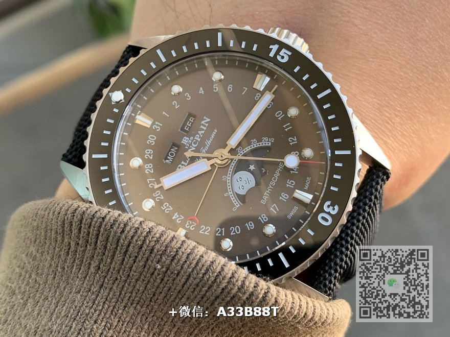 【品牌】宝珀【产品介绍】TW厂手表力作宝铂五十寻系列,5054-1110-B52A。压轴巨献,大三针夜光设计,直径43毫米,厚度13.3毫米!搭载6654.P自动机械机芯,具备星期显示,日期显示。月份显示,年份显示,月相显示,壳身轮廓分明,线条清晰决绝。优雅、律动之下隐藏着刚毅成熟的美。满足运动,商务,多功能性佩戴。定让君能依芯所向!TW诚意之作值得你拥有!【尺寸】43mmX13.3mm【表带】尼龙纤维表带,内侧牛皮【镜面】蓝宝石镜面【机芯】cal.6654机芯【防水】50米【配件】原装盒,说明书,质保卡,吊牌,香港机打发票【品质检测】保证所有手表实物拍摄,所见即所得 , 手表发货前都会有严格检查测试,确保您收到的手表无质量问题