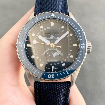 【品牌】宝珀【产品介绍】IT新品 宝珀 全新Ait Command空军司令系列AC02,极具传奇色彩的计时码表,新款空军司令在设计上忠于历史传统,并将上世纪50年代的复古风格和宝珀的高级制表工艺充分融合!表壳采用钛金属材料,表径42.5mm,手表表耳修长,表耳正面、表壳侧面全部拉丝,只有表耳边缘有一道抛光与正品一致。机芯搭载7750计时机芯改F388B机芯,走时精准,所有细节按照原版1:1复刻。圈口双向静音旋转与正品一致,陶瓷圈进行了抛光,陶瓷圈上的所有刻度,包括12点位菱形块,全部都有夜光。盘面使用双眼计时盘,3点位是30分钟计时、9点位是12小时计时。盘面大型数字时标,以及大型注射器指针,都有夜光涂层。测速圈和计时刻度,位于盘面边缘。原版拉丝表扣搭配复古蓝色皮表带,满满的复古风。【款式】男款【尺寸】直径42.5mm【表带】进口牛皮表带【镜面】蓝宝石镜面【机芯】复刻正品F388B机芯【防水】50米【配件】原装盒,说明书,质保卡,吊牌,香港机打发票【品质检测】保证所有手表实物拍摄,所见即所得 , 手表发货前都会有严格检查测试,确保您收到的手表无质量问题