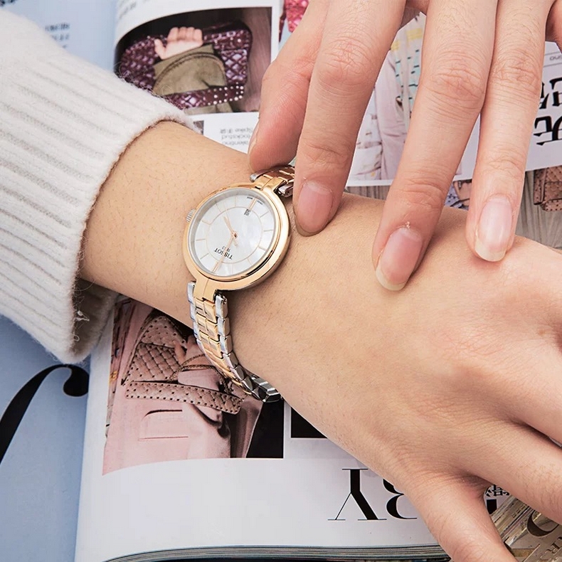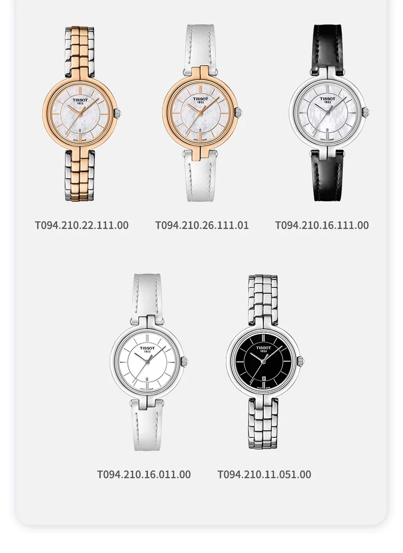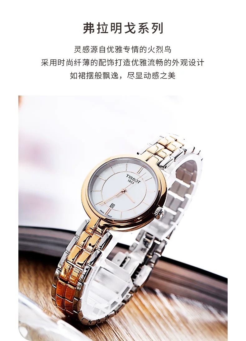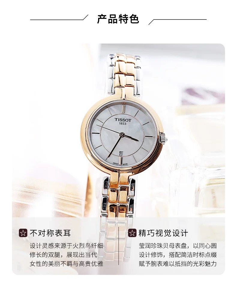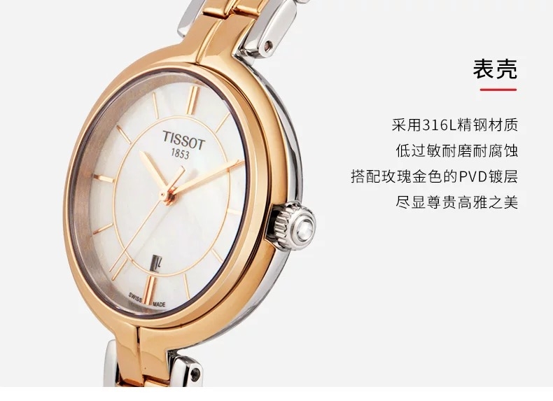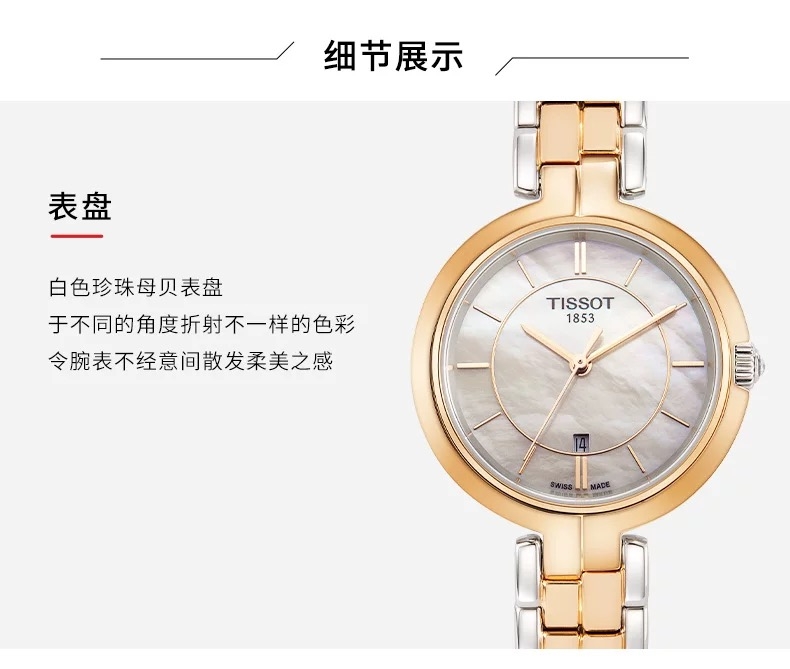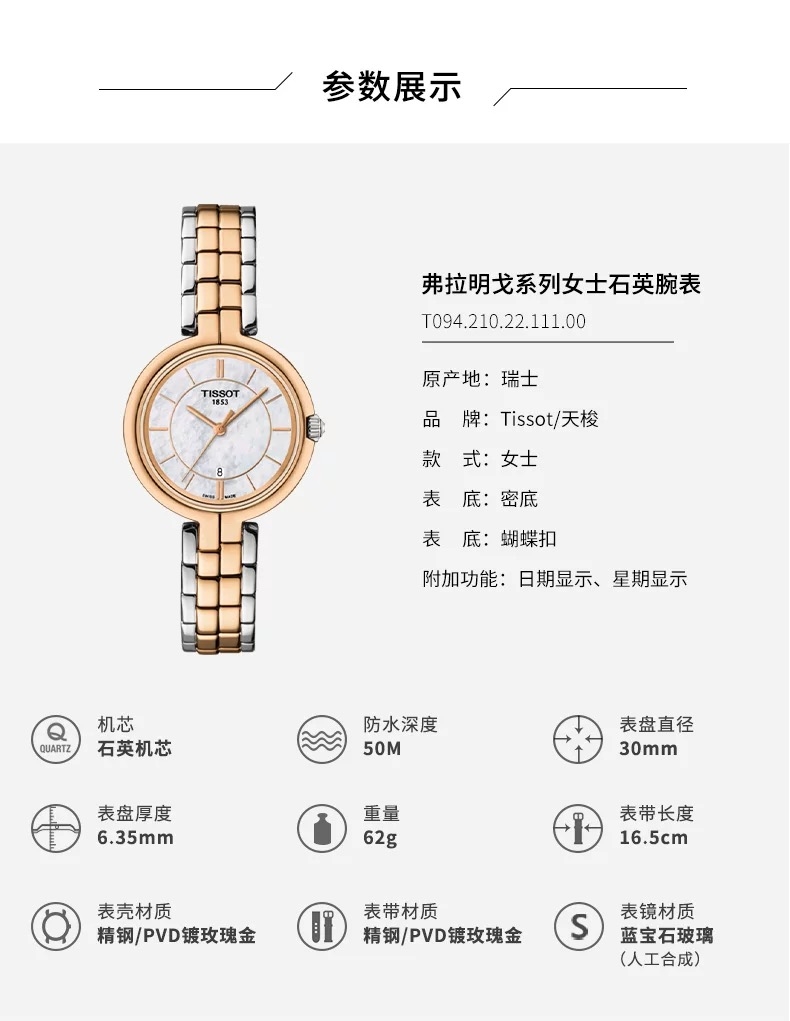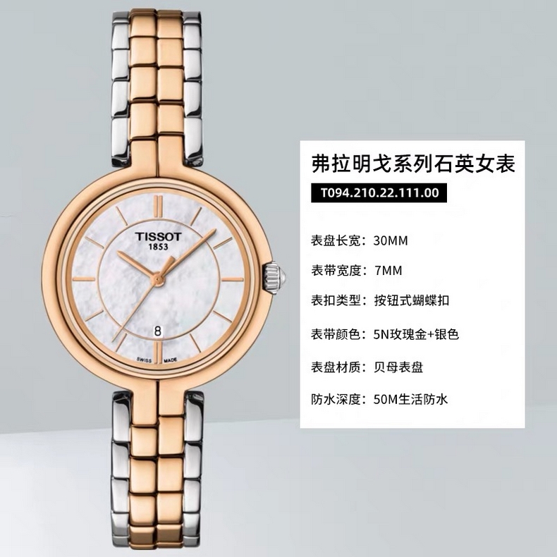 【品牌】天梭【产品介绍】原单专柜天梭最经典款式!天梭钢带款式!天梭t094系列石英腕表!佛拉明戈系列女士石英腕表!原装进口(F03.111-6H)瑞士机芯!非市面上朗达机芯。蓝宝石精钢表带!三针计时带日历!贝母表盘!生活防水!【款式】女款【尺寸】直径30mm【表带】精钢表带【镜面】蓝宝石镜面【机芯】瑞士F03.111机芯【防水】50米【配件】原装盒,说明书,质保卡,吊牌,香港机打发票【品质检测】保证所有手表实物拍摄,所见即所得 , 手表发货前都会有严格检查测试,确保您收到的手表无质量问题