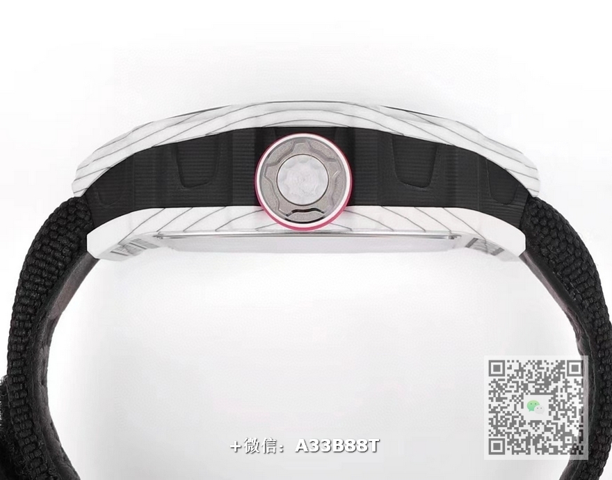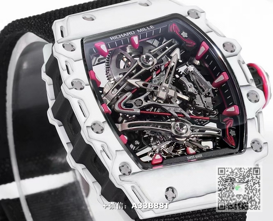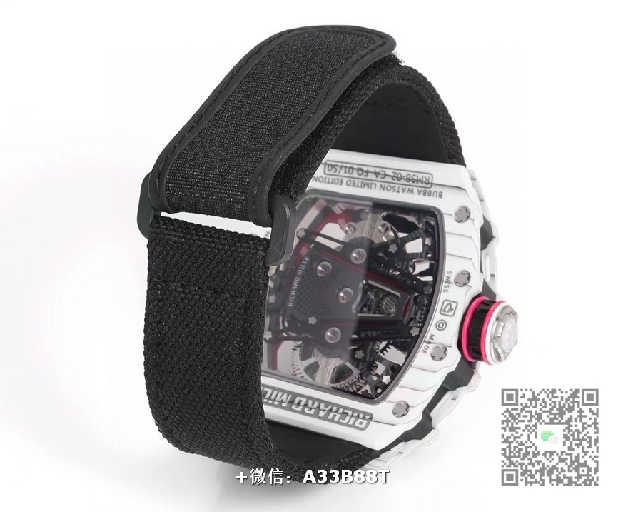 【品牌】理查德米勒【产品介绍】新表RICHARD MILLE 理查米尔 推出 RM 38-02 Tourbillon Bubba Watson 粉色主题镂空陀飞轮腕表:高尔夫球灵感风格醒目的新作——「RM 38-02 Tourbillon Bubba Watson」陀飞轮腕表与高尔夫职业球手 Bubba Watson 合作设计,独特的粉红色来自这位高尔夫名将钟爱的 PING 一号球杆,风格尤为明快,让人心生愉悦。新作表圈和底盖采用粉色和白色石英碳纤维复合材料加工而成,中层表壳则以碳纤维和粉色石英碳纤维制成,每一个表壳都有独一无二的交错纹理。梯桶形表壳能够更舒适紧密的贴合手腕,表冠顶部巧妙模仿高尔夫球的凹凸造型,是颇为有趣的细节。全开放式表盘让佩戴者清晰欣赏机芯的完整运转,镂空桥板在表盘中勾勒出横向的「V」字形,粉色手绘图案则来自 Bubba Watson 使用的球杆杆头。6点陀飞轮结构能够承受10000g冲击力,职业球手在高速击杆时也能稳定运转。搭载 RM 38-02 手动上链机芯,摆频28800vph,提供52小时动力储备。这枚机芯采用碳纤维制作镂空底板,具备优异的防震性能。桥板依然为坚固的 5级钛金属材质,背面的小孔亦融入粉色元素装饰。【款式】男款【尺寸】43.70 x 50.04mm【表带】橡胶表带/尼龙纤维表带,两种表带类型可供选择,二选一【镜面】蓝宝石镜面【机芯】RM38-02手动陀飞轮机芯【防水】50米防水【配件】原装盒,说明书,质保卡,吊牌,香港机打发票【品质检测】保证所有手表实物拍摄,所见即所得 , 手表发货前都会有严格检查测试,确保您收到的手表无质量问题