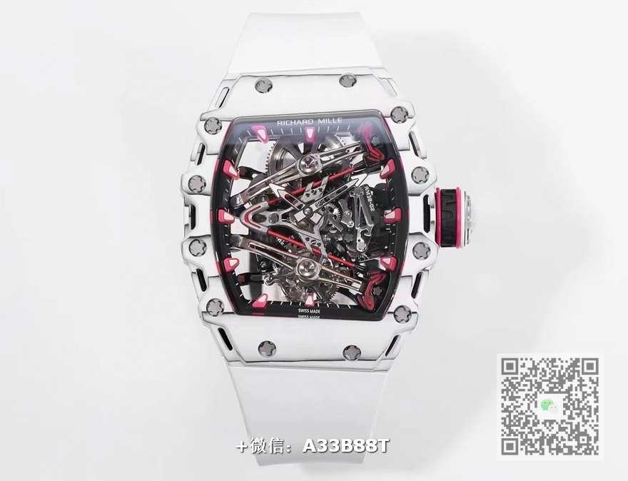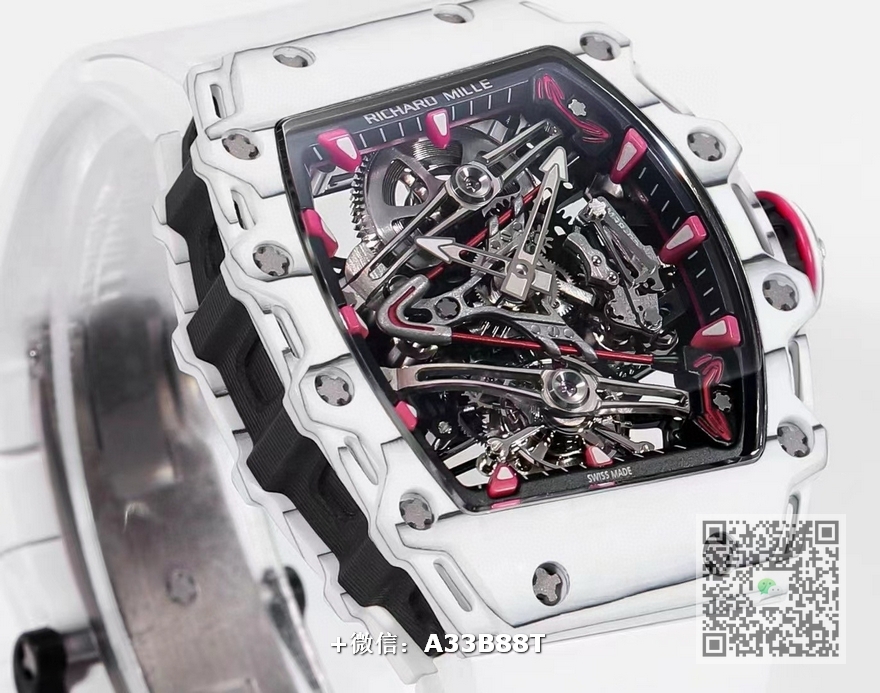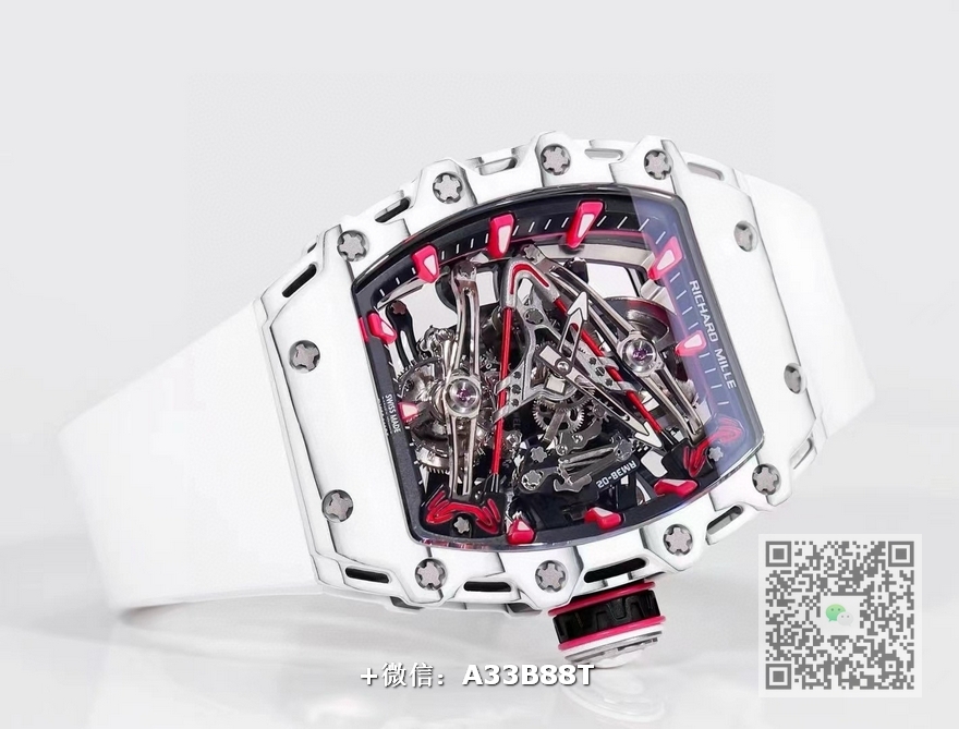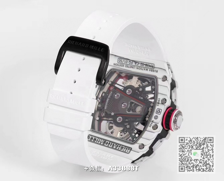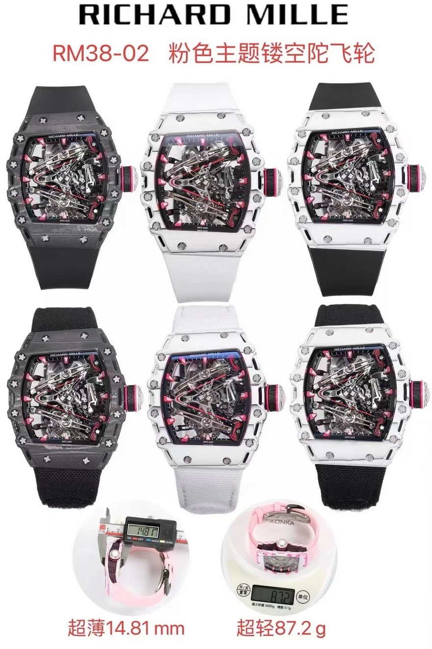 【品牌】理查德米勒【产品介绍】新表RICHARD MILLE 理查米尔 推出 RM 38-02 Tourbillon Bubba Watson 粉色主题镂空陀飞轮腕表:高尔夫球灵感风格醒目的新作——「RM 38-02 Tourbillon Bubba Watson」陀飞轮腕表与高尔夫职业球手 Bubba Watson 合作设计,独特的粉红色来自这位高尔夫名将钟爱的 PING 一号球杆,风格尤为明快,让人心生愉悦。新作表圈和底盖采用粉色和白色石英碳纤维复合材料加工而成,中层表壳则以碳纤维和粉色石英碳纤维制成,每一个表壳都有独一无二的交错纹理。梯桶形表壳能够更舒适紧密的贴合手腕,表冠顶部巧妙模仿高尔夫球的凹凸造型,是颇为有趣的细节。全开放式表盘让佩戴者清晰欣赏机芯的完整运转,镂空桥板在表盘中勾勒出横向的「V」字形,粉色手绘图案则来自 Bubba Watson 使用的球杆杆头。6点陀飞轮结构能够承受10000g冲击力,职业球手在高速击杆时也能稳定运转。搭载 RM 38-02 手动上链机芯,摆频28800vph,提供52小时动力储备。这枚机芯采用碳纤维制作镂空底板,具备优异的防震性能。桥板依然为坚固的 5级钛金属材质,背面的小孔亦融入粉色元素装饰。【款式】男款【尺寸】43.70 x 50.04mm【表带】橡胶表带/尼龙纤维表带,两种表带类型可供选择,二选一【镜面】蓝宝石镜面【机芯】RM38-02手动陀飞轮机芯【防水】50米防水【配件】原装盒,说明书,质保卡,吊牌,香港机打发票【品质检测】保证所有手表实物拍摄,所见即所得 , 手表发货前都会有严格检查测试,确保您收到的手表无质量问题
