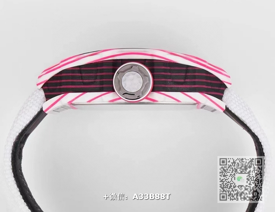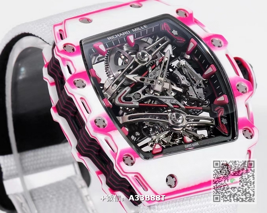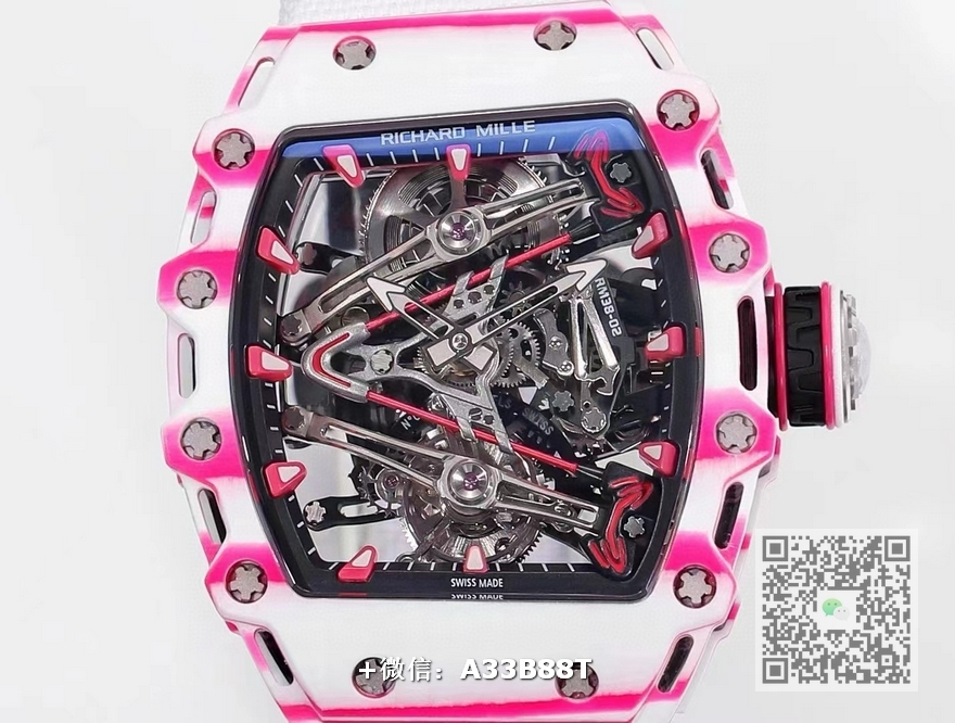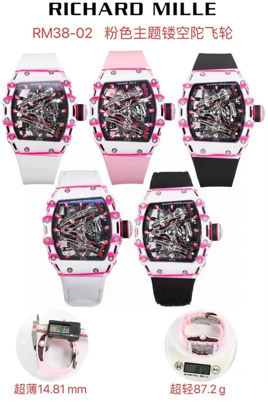 【品牌】理查德米勒【产品介绍】新表RICHARD MILLE 理查米尔 推出 RM 38-02 Tourbillon Bubba Watson 粉色主题镂空陀飞轮腕表:高尔夫球灵感风格醒目的新作——「RM 38-02 Tourbillon Bubba Watson」陀飞轮腕表与高尔夫职业球手 Bubba Watson 合作设计,独特的粉红色来自这位高尔夫名将钟爱的 PING 一号球杆,风格尤为明快,让人心生愉悦。新作表圈和底盖采用粉色和白色石英碳纤维复合材料加工而成,中层表壳则以碳纤维和粉色石英碳纤维制成,每一个表壳都有独一无二的交错纹理。梯桶形表壳能够更舒适紧密的贴合手腕,表冠顶部巧妙模仿高尔夫球的凹凸造型,是颇为有趣的细节。全开放式表盘让佩戴者清晰欣赏机芯的完整运转,镂空桥板在表盘中勾勒出横向的「V」字形,粉色手绘图案则来自 Bubba Watson 使用的球杆杆头。6点陀飞轮结构能够承受10000g冲击力,职业球手在高速击杆时也能稳定运转。搭载 RM 38-02 手动上链机芯,摆频28800vph,提供52小时动力储备。这枚机芯采用碳纤维制作镂空底板,具备优异的防震性能。桥板依然为坚固的 5级钛金属材质,背面的小孔亦融入粉色元素装饰。【款式】男款【尺寸】43.70 x 50.04mm【表带】橡胶表带/尼龙纤维表带,两种表带类型可供选择,二选一【镜面】蓝宝石镜面【机芯】RM38-02手动陀飞轮机芯【防水】50米防水【配件】原装盒,说明书,质保卡,吊牌,香港机打发票【品质检测】保证所有手表实物拍摄,所见即所得 , 手表发货前都会有严格检查测试,确保您收到的手表无质量问题