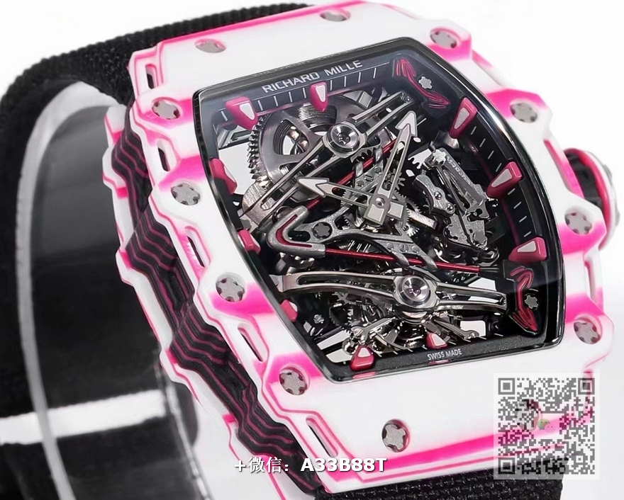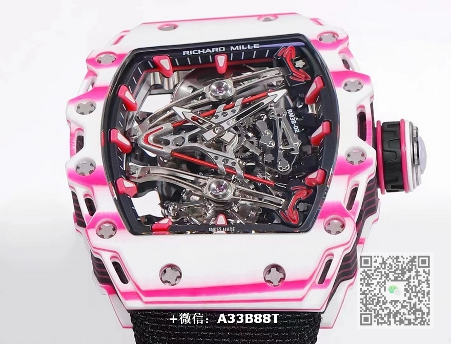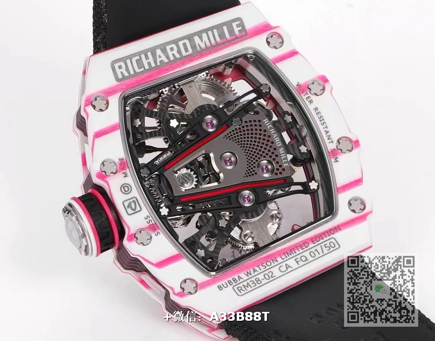 【品牌】理查德米勒【产品介绍】新表RICHARD MILLE 理查米尔 推出 RM 38-02 Tourbillon Bubba Watson 粉色主题镂空陀飞轮腕表:高尔夫球灵感风格醒目的新作——「RM 38-02 Tourbillon Bubba Watson」陀飞轮腕表与高尔夫职业球手 Bubba Watson 合作设计,独特的粉红色来自这位高尔夫名将钟爱的 PING 一号球杆,风格尤为明快,让人心生愉悦。新作表圈和底盖采用粉色和白色石英碳纤维复合材料加工而成,中层表壳则以碳纤维和粉色石英碳纤维制成,每一个表壳都有独一无二的交错纹理。梯桶形表壳能够更舒适紧密的贴合手腕,表冠顶部巧妙模仿高尔夫球的凹凸造型,是颇为有趣的细节。全开放式表盘让佩戴者清晰欣赏机芯的完整运转,镂空桥板在表盘中勾勒出横向的「V」字形,粉色手绘图案则来自 Bubba Watson 使用的球杆杆头。6点陀飞轮结构能够承受10000g冲击力,职业球手在高速击杆时也能稳定运转。搭载 RM 38-02 手动上链机芯,摆频28800vph,提供52小时动力储备。这枚机芯采用碳纤维制作镂空底板,具备优异的防震性能。桥板依然为坚固的 5级钛金属材质,背面的小孔亦融入粉色元素装饰。【款式】男款【尺寸】43.70 x 50.04mm【表带】橡胶表带/尼龙纤维表带,两种表带类型可供选择,二选一【镜面】蓝宝石镜面【机芯】RM38-02手动陀飞轮机芯【防水】50米防水【配件】原装盒,说明书,质保卡,吊牌,香港机打发票【品质检测】保证所有手表实物拍摄,所见即所得 , 手表发货前都会有严格检查测试,确保您收到的手表无质量问题
