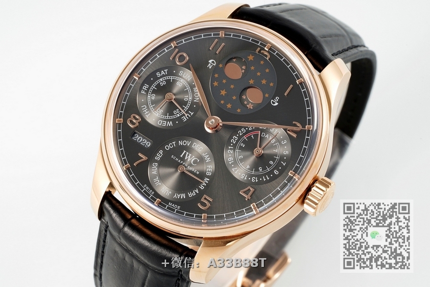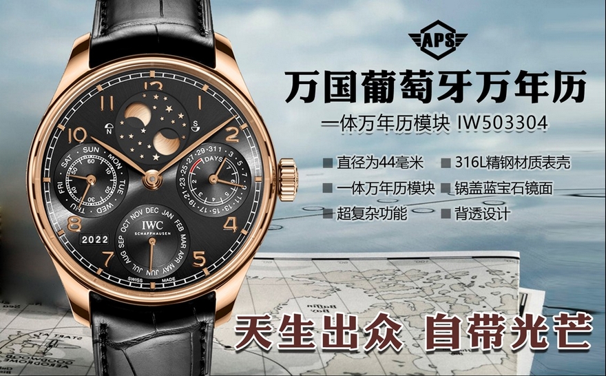 【品牌】万国【产品介绍】 APS新品 万国葡萄牙系列万年历腕表,复刻界最复杂的腕表,所有功能同步原装,所有功能调节通过把头控制【功能介绍】12点日月星辰,9点钟独立小秒针和星期指针显示,6点钟月份指针,同时联动7点钟位置的年份显示,每12个月年份跳动一下,3点钟则是最经典的动力显示指针和日期显示,每一根针都是真实可用区分市面上的小厂两根针粘在一起【做工精细】外壳采用原版同样的三件套结构,中间拉丝,上下壳为抛光,镜面采用高成本的锅盖形蓝宝石,使其质感提升【机芯性能】尺寸44.2mmX14.9mm,基础机芯采用葡七基础机芯,高效稳定,动力时间长达72小时以上,加装复杂的万年历模块,而且同步原装所有功能实现同步原装通过把头调节【品控QC】由于万年历模块十分复杂在出货前都会调准时间,客户收到直接上链上手佩戴即可,️不要轻易乱调,确实需要调节时,先把时间调到下午8点整再去调试其他功能,调试时先手动对准星期,拔出一节往上拧调节月份(12个月联动年份),往下拧三圈左右开始调节日历APS用心做表,从细节出发【款式】男款【尺寸】44.2mmx14.9mm【表带】牛皮表带【镜面】蓝宝石镜面【机芯】定制版52615机芯【防水】50米【配件】原装盒,说明书,质保卡,吊牌,香港机打发票【品质检测】保证所有手表实物拍摄,所见即所得 , 手表发货前都会有严格检查测试,确保您收到的手表无质量问题